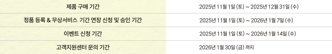 이벤트 제품 구매 기간인 2025년 11월 1일(토)부터 2025년 12월 31일(수)까지 구매한 대상 제품만 응모가 가능하며, 구매 기간 내에 제품 구매 후, 2026년 1월 7일(수)까지 정품 등록과 무상 서비스 기간 연장 신청 및 승인 완료 후, 2026년 1월 14일(수)까지 본 이벤트 페이지에서 경품 신청을 완료하여야 합니다. (단, 타인의 정품 등록 취소 이력이 있는 제품, 양도, 중고, 리퍼, 환불받은 제품, 수리교환품 등은 해당되지 않습니다. 동일 ID나 IP 등 당사 판단 기준에 의한 대리/대행 등록의 경우 관련 고객 모두 이벤트 대상에서 제외될 수 있습니다.)